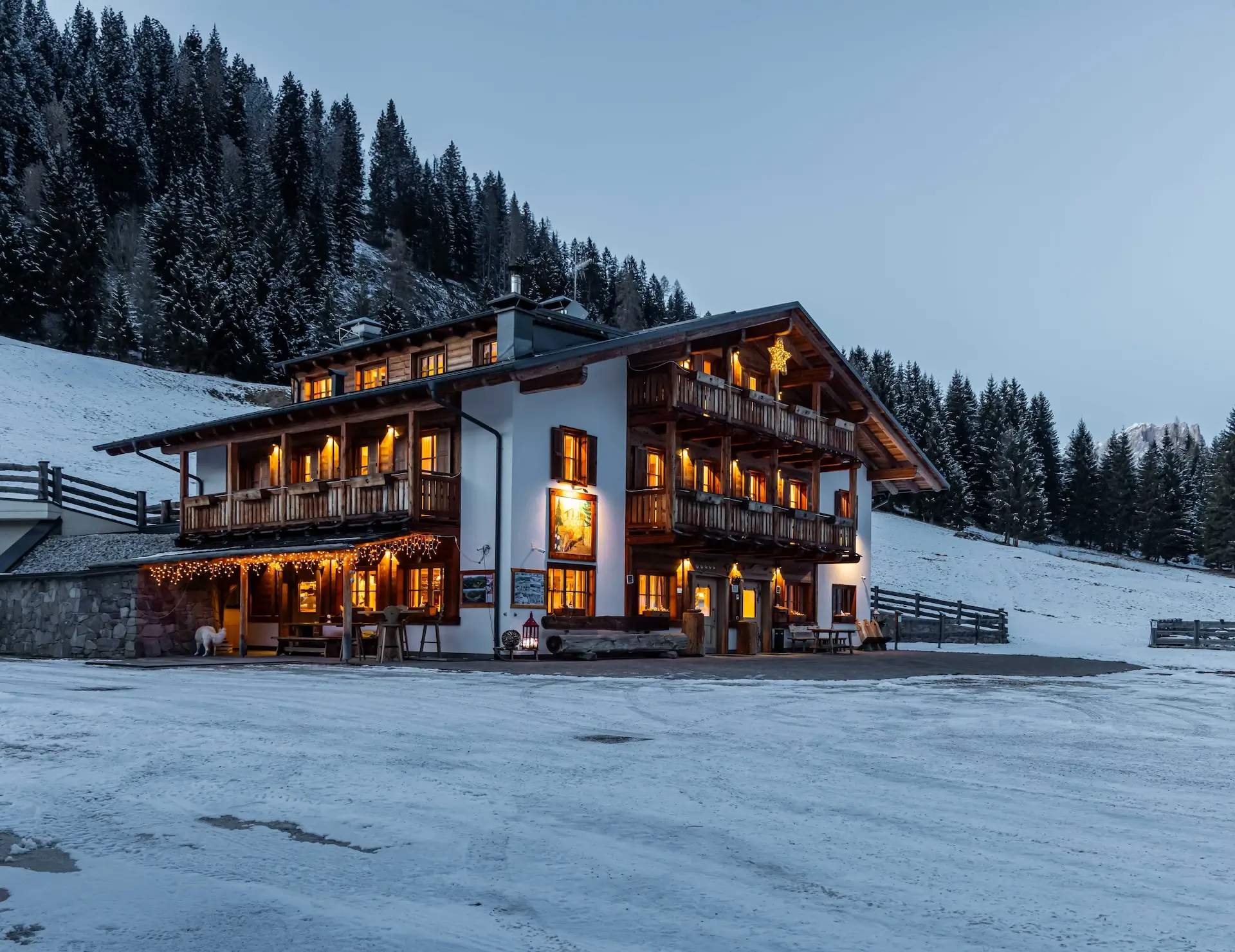 La struttura è costruita in legno seguendo i princìpi della bioedilizia per un minore impatto ambientale, ed è circondata da un ampio giardino con una vista spettacolare sulle Dolomiti. Questo è lo spazio perfetto per passare del buon tempo all’aria aperta tra i giochi per bambini, l’orto e gli animali della fattoria (mucche, capre, pony, cavalli da tiro, asini, galline). Con la bella stagione, si può anche mangiare all’aria aperta circondati dal magnifico panorama, i prati rigogliosi e il caldo sole estivo.