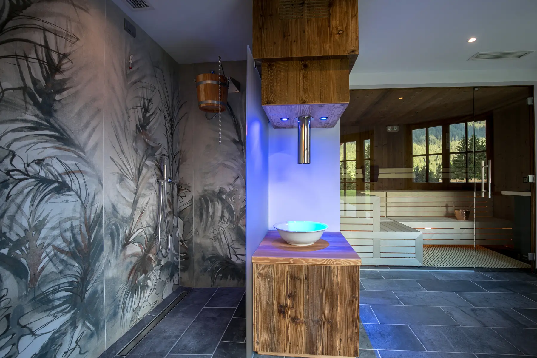 Ogni area del centro benessere ha ampie finestre che permettono di godersi il magnifico panorama delle Dolomiti, rendendo l’esperienza ancora più rilassante.