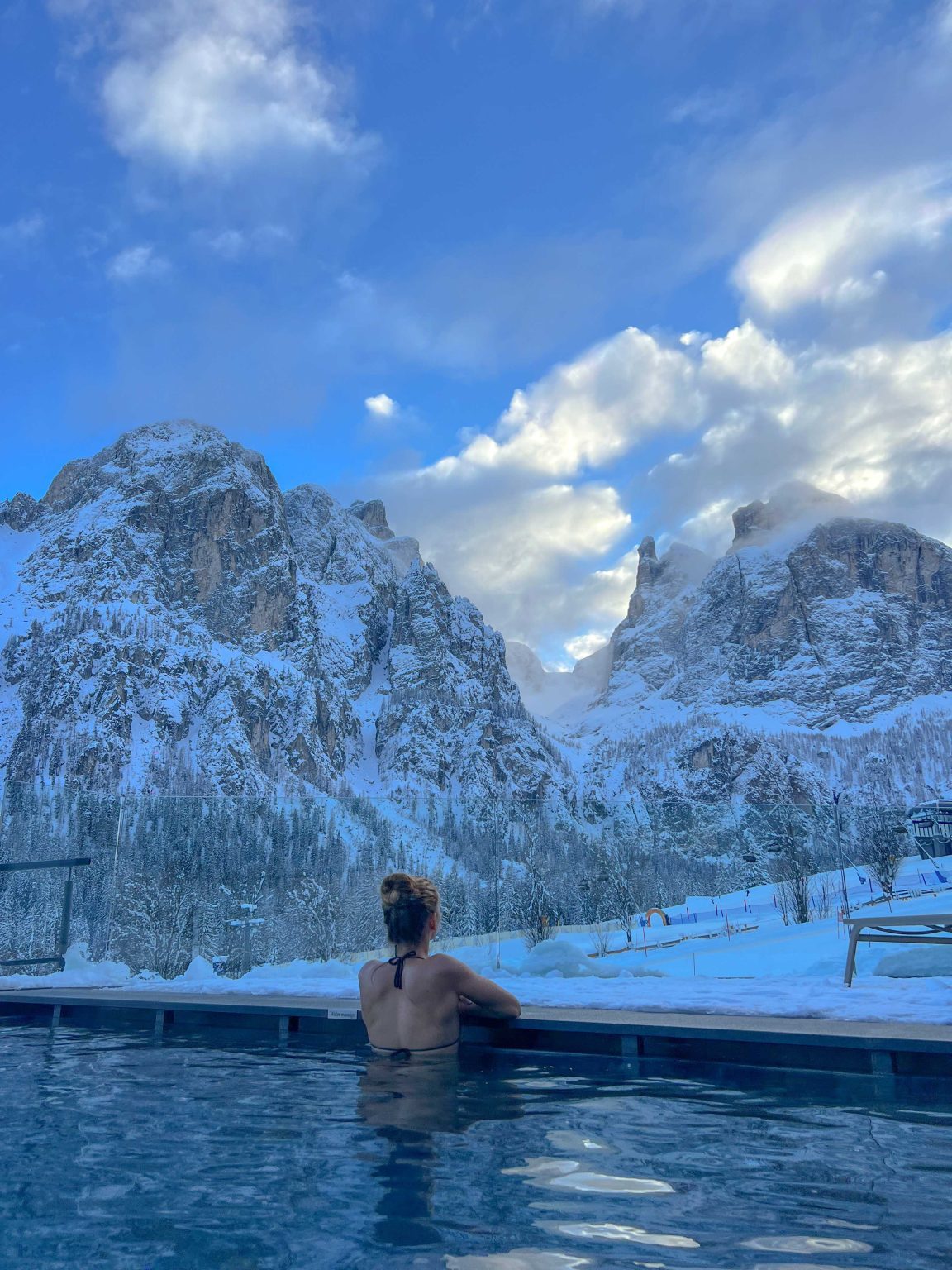 Wellness steht im Mittelpunkt. Das Wellness-Zentrum verfügt über ein türkisches Bad, Saunen, einen Fitnessraum, ein Spa und ein großes Chlorozon-Schwimmbad im Freien mit Blick auf das Sella-Massiv.